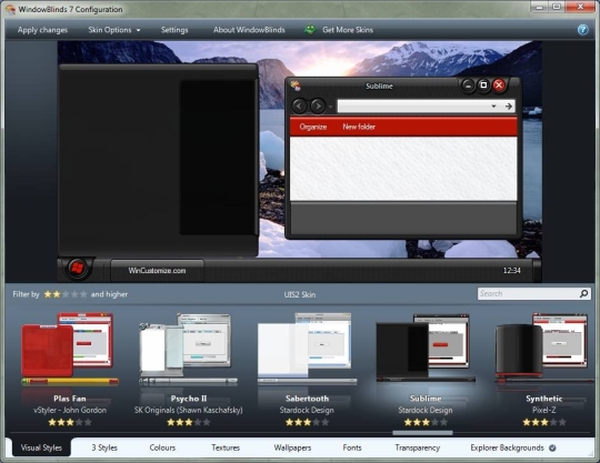 WindowBlinds comes with a number of visual styles to get you started. From there you can modify them by changing the color, adding a texture, wallpaper, changing fonts, adjusting transparency, or blur. Create, edit and apply textures. Use UIS0 to apply textures to the Windows Aero visual style. Live previews of skins and transparencies. In addition, you can download thousands of free visual styles from the popular WinCustomize.com. With the addition of the separate SkinStudio, you can create your own skins for use with WindowBlinds.What's new in this version: Version 7.40 includes fix for IE sizing issue, Opera repaint issue on scrolling, blurred borders on large bordered skins, and for UltraMon secondary taskbar.